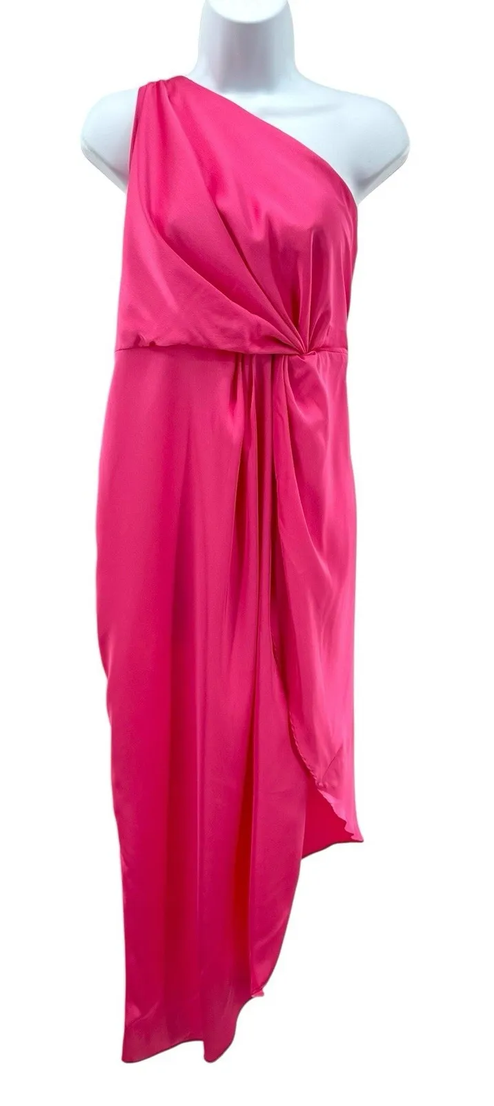 Elegant and eye-catching, this Whyte Valentyne dress features a bold hot pink satin finish with a one-shoulder neckline and draped knot detail at the waist. Asymmetrical hemline and lightweight 100% polyester fabric create a flowy, flattering silhouette. Perfect for weddings, cocktail parties, and special occasions. Details: • Brand: Whyte Valentyne • Size: 14 • Color: Hot Pink • Style: One-Shoulder Asymmetrical Midi Dress • Material: 100% Polyester • Length: 56" • Pit to Pit: 19" • Unlined, lightweight • Pull-on style with draped waist detail • Occasion: Cocktail, Formal, Wedding Guest, Evening Whyte Valentyne, one shoulder, asymmetrical dress, satin cocktail dress, pink evening dress, wedding guest outfit, special occasion dress, midi dress, draped waist, size 14 formal dress, hot pink satin