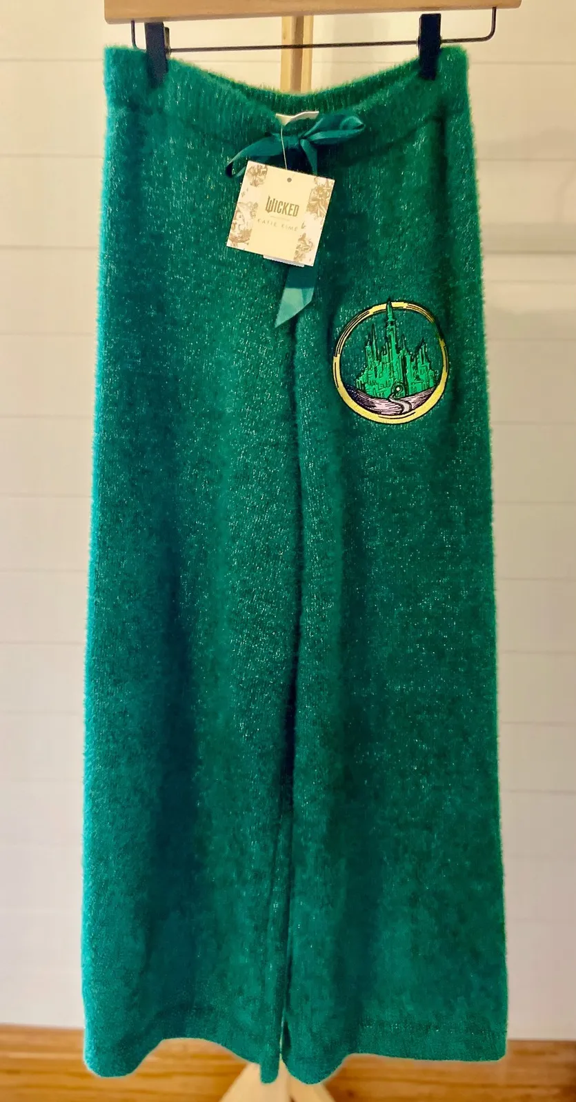 Emerald green fuzzy wide leg pants from Wicked by Katie Kime. These plush pants feature a comfortable wide leg silhouette and a drawstring waist for an adjustable fit. Adorned with an embroidered patch of the Emerald City from the Wizard of Oz on the left hip, these pants offer a whimsical touch. Perfect for a cozy night in, a casual outing, or a themed party. Style: Sweatpants Department: Women Material: Acrylic, Polyester Leg Style: Wide-Leg Type: Pants Fabric Type: Knit Features: Elastic Waist, Comfort Closure: Drawstring, Tie Pattern: Solid Accents: Embroidered Theme: Movie Occasion: Casual Fit: Relaxed Front Type: Flat Front Season: Fall, Winter Keywords: Wicked, Katie Kime, emerald green, fuzzy pants, plush, wide leg, drawstring waist, Wizard of Oz, Emerald City, whimsical, lounge pants, cozy, themed, novelty