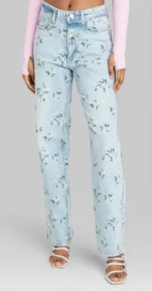 Trendy and feminine denim with a retro-inspired floral print and relaxed straight-leg fit. These jea... Show more