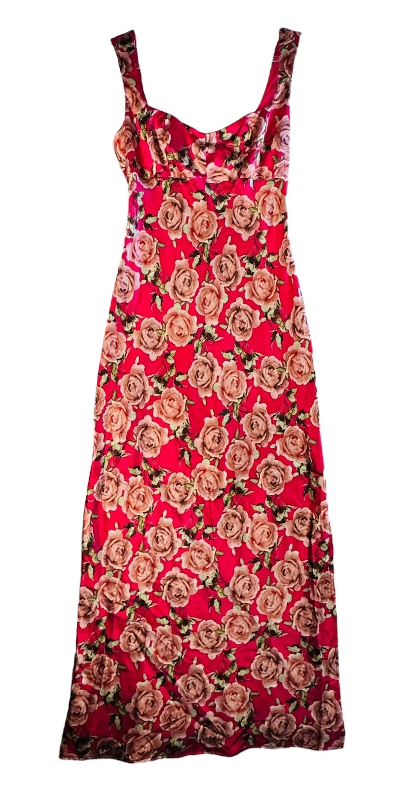 Romantic pink rose print maxi dress with square neckline and fitted silhouette, channeling 90s reviv... Show more