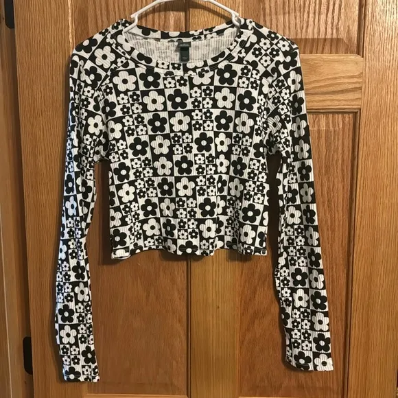 Wild Fable Black Floral Checkered Cropped Long Sleeve Top, Large NWT