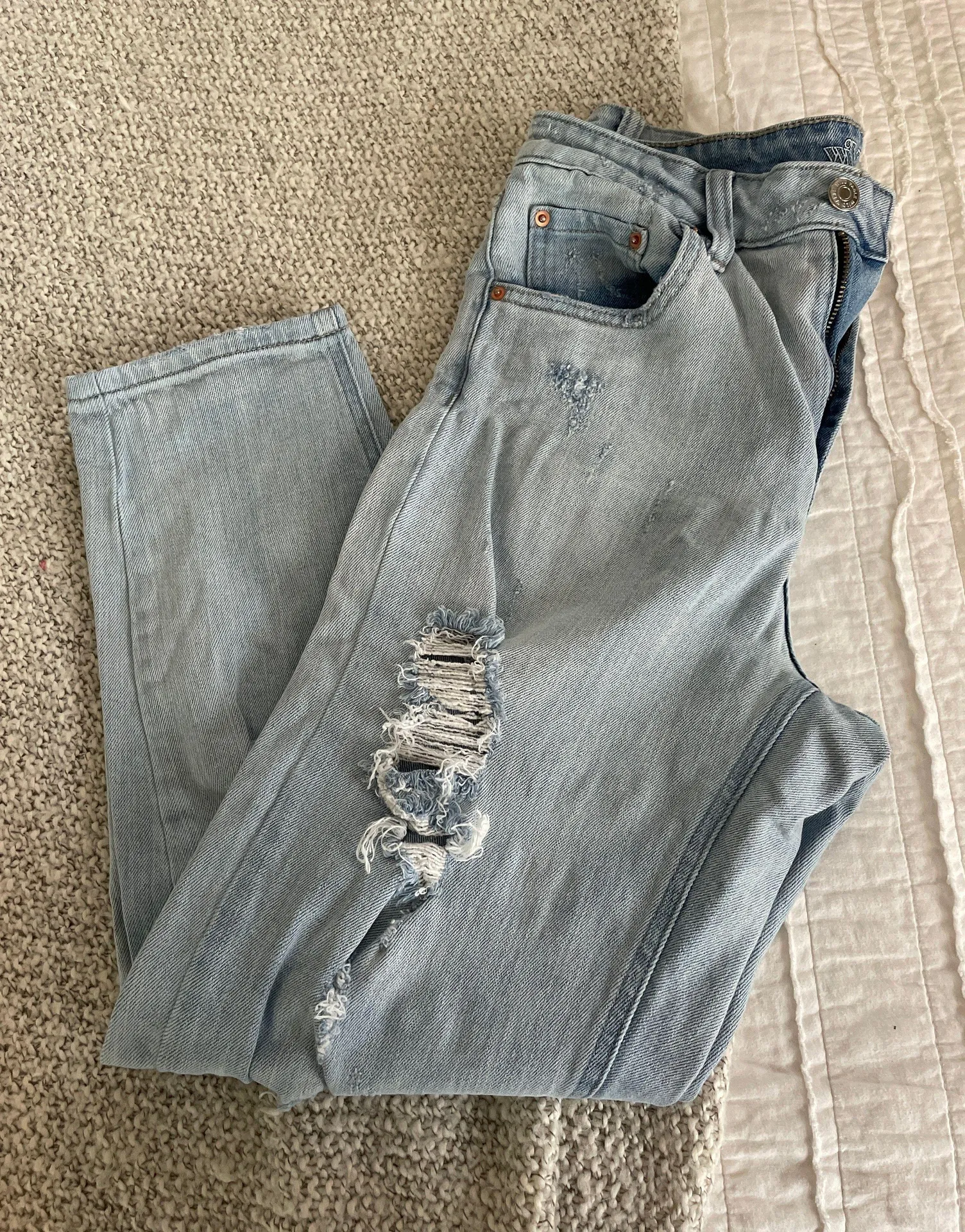 Light wash mom jeans. Straight leg with a lot of distress. Fit true to size and very comfortable. Wo... Show more