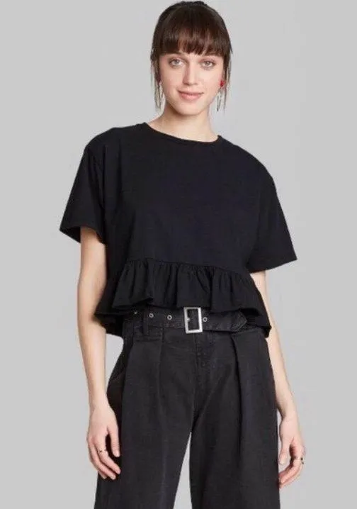 NWOT: new without tags! Black knit short-sleeved high-cut top featuring a peplum ruffle hem! Size Sm... Show more