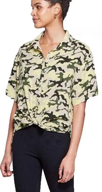 NWOT: new without tags! Beige/green/yellow camouflage-print button-up collared shirt with short slee... Show more