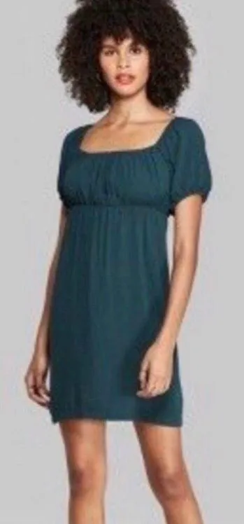 NWOT: brand new without tags! Forest green ribbed knit mini babydoll dress with puffy sleeves and a... Show more