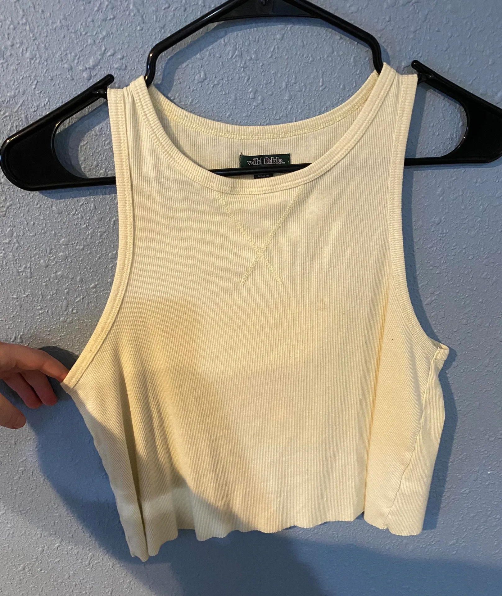 light yellow high neck tank. barley worn. good condition. kinda cropped and kinda see through so don... Show more