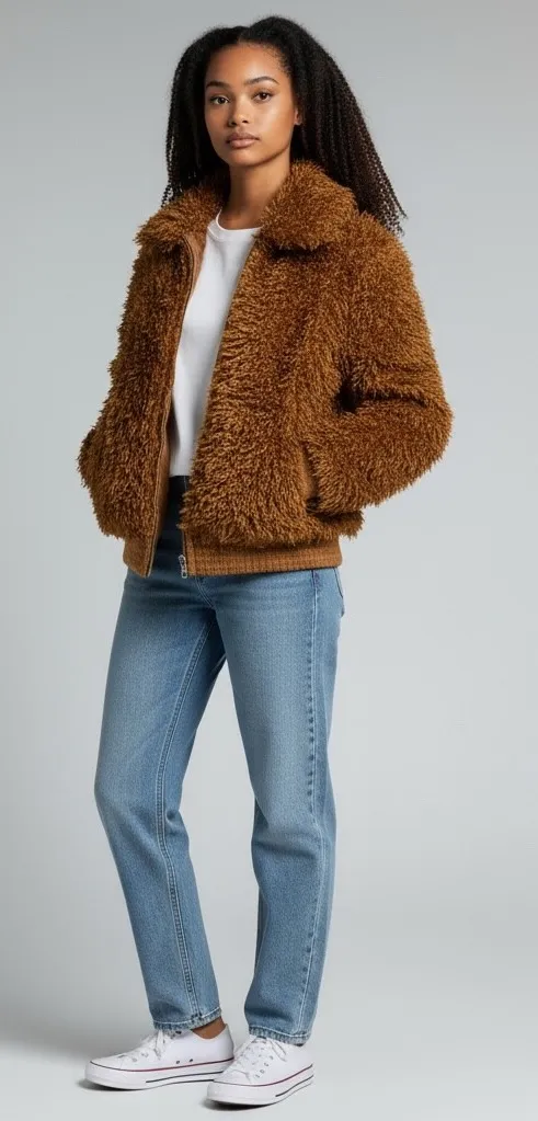 Introducing a supremely cozy jacket that will instantly elevate your outerwear game. This plush, faux-fur teddy jacket is a luxurious statement piece perfect for adding warmth and style to any ensemble. Featuring a classic bomber silhouette, complete with a full zip closure and ribbed knit trim, this jacket is designed for both comfort and fashion-forward flair. The rich, brown hue complements its wonderfully soft, textured finish. Perfect for crisp autumn strolls, casual coffee dates, or adding a touch of luxe to your everyday style.