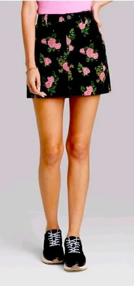 Wild Fable Black Pink Floral Corduroy High Rise Mini Skirt Women Size 8