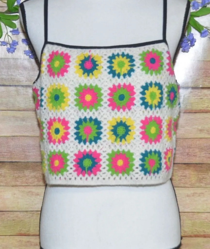 This vibrant crop tank top features a charming granny squares knit design with floral crochet detail... Show more