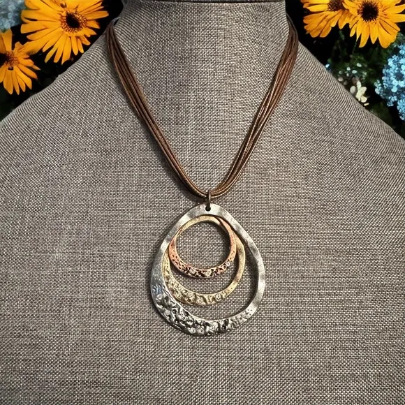 NWT. 5 brown leather cords with 3 (copper, silver and gold) hammered rings. Clear crystal details on... Show more