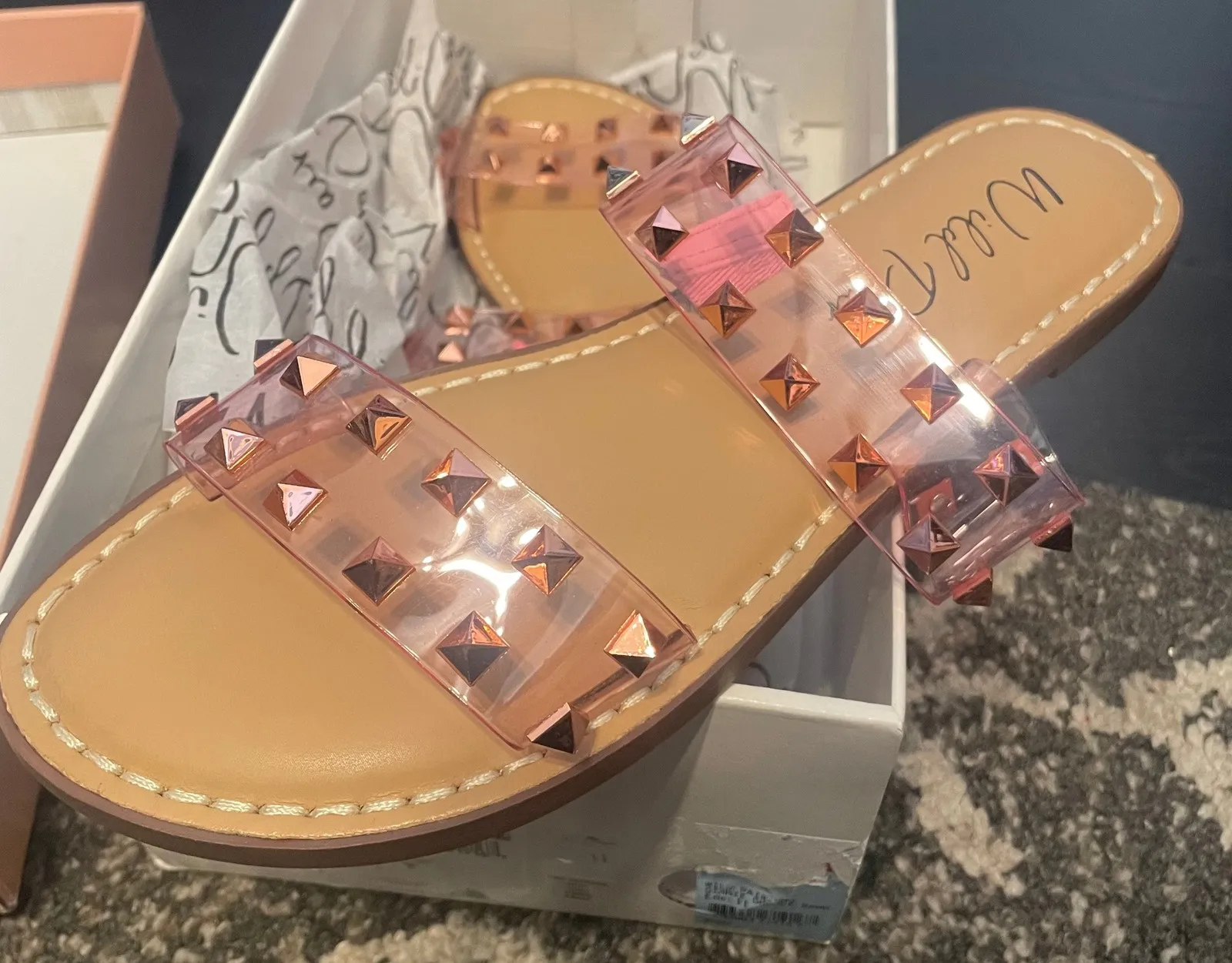 Wild Pair Ginniev slide sandals with rose gold studs and clear straps. These sandals feature a comfo... Show more