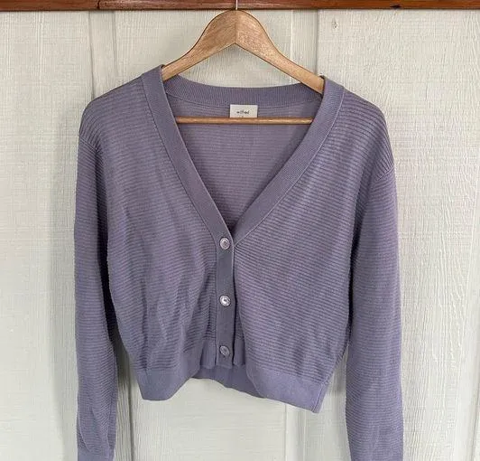 . Stay cozy and stylish with this lilac button-up cardigan sweater. Perfect for layering, this sweat... Show more