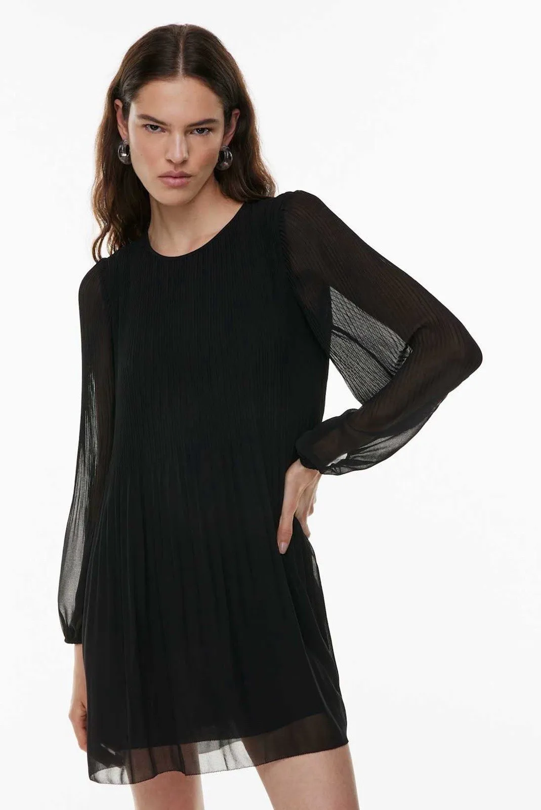 Chic and versatile Wilfred Daydreamer Mini Dress in timeless black. This feminine style features a pleated chiffon overlay with sheer long sleeves, a relaxed silhouette, and a back keyhole closure. Perfectly lined for comfort, this dress can be dressed up with heels for a night out or styled with boots for an effortless daytime look. • Brand: Wilfred (Aritzia) • Style: Daydreamer Mini Dress • Color: Black • Size: Medium • Shell: 100% Polyester • Lining: 100% Polyester • Care: Machine wash cold inside out, hang to dry, or dry clean • Key Features: Pleated chiffon fabric, sheer long sleeves, lined body, flowy A-line shape Measurements (approx.): • Length: 35" • Pit to pit: 20" • Sleeve: 25" Wilfred dress, Aritzia dress, black mini dress, chiffon pleated dress, long sleeve party dress, cocktail dress, semi formal dress, flowy shift dress, date night outfit