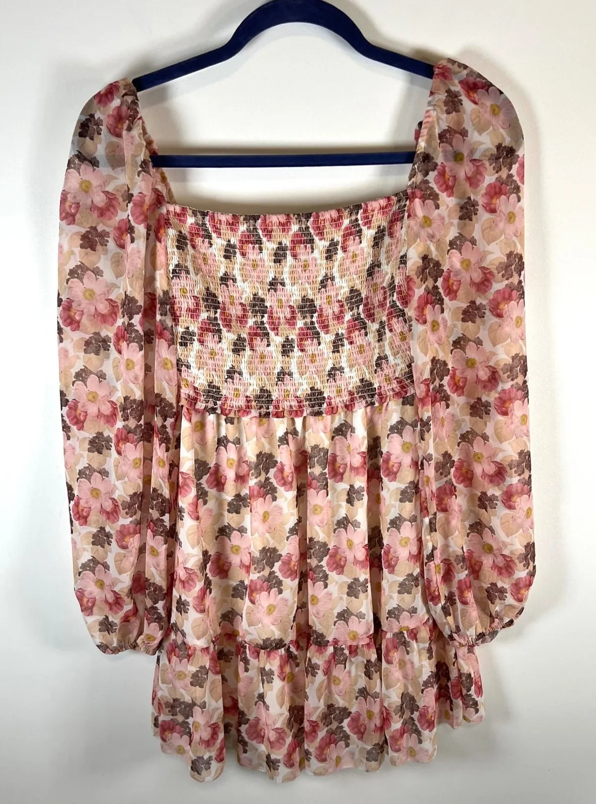 Capture the essence of a romantic garden with this enchanting Wilfred mini dress. A flattering smocked bodice hugs your figure beautifully, while the delicate floral print in soft pinks, creams, and earthy tones evokes a whimsical charm. The sheer chiffon overlay creates a light and airy feel, perfect for breezy days. Square neckline and voluminous long sleeves add a touch of vintage allure, and the tiered hemline creates a playful, flirty silhouette. Ideal for a charming brunch date, a casual daytime outing, or a romantic picnic. Armpit to armpit-11 inches length-28 inches Style: Sundress, Trapeze & Swing Dress Length: Short Department: Women Sleeve Length: Long Sleeve Pattern: Floral Occasion: Casual, Party/Cocktail Material: Polyester, Polyester Blend Fabric Type: Chiffon Theme: Nature Neckline: Square Neck Garment Care: Machine Washable Country of Origin: China Keywords: Wilfred dress, floral print dress, smocked dress, square neck dress, tiered dress, mini dress, chiffon dress, boho dress, feminine dress, spring dress, summer dress, romantic dress, casual dress