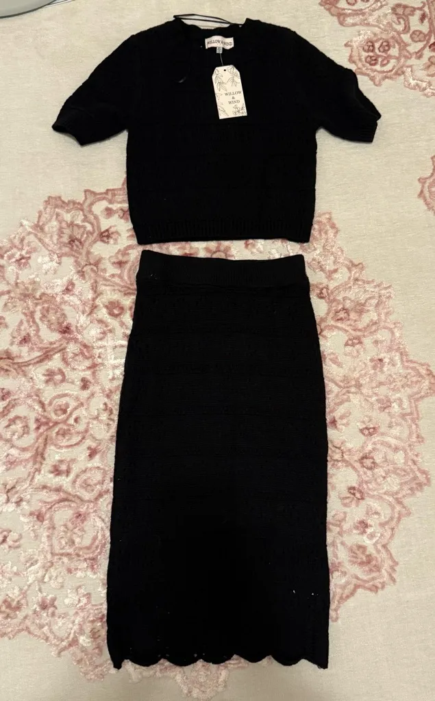 Stylish black sweater & skirt set by Willow & Wind. Perfect for any occasion. Brand new with tags Size XSmall Cotton blend Crochet set MIDI length skirt Short sleeve Crewneck sweater top