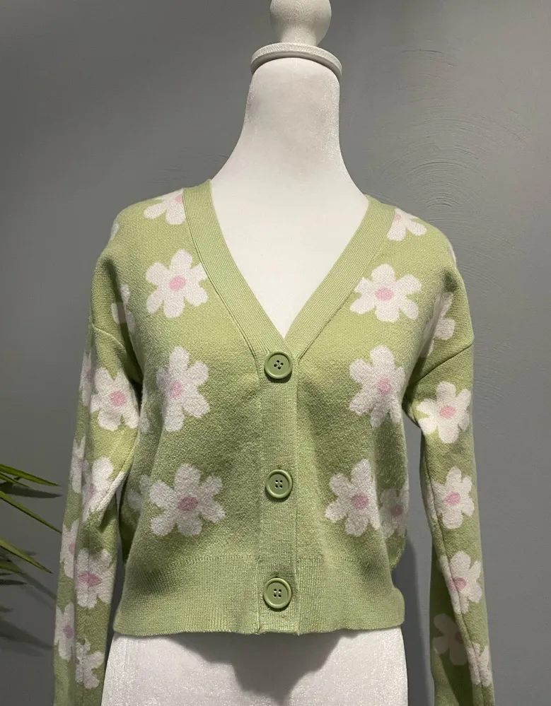 This Willow & Wind Cropped Daisy Cardigan is a charming and playful sweater that is perfect for any casual or retro-inspired look. It features a soft, cozy knit fabric in a vibrant green with an all-over white and pink daisy pattern. The cardigan has a flattering V-neck, a classic button-down front, and long sleeves with ribbed cuffs. Its cropped length pairs perfectly with high-waisted jeans, skirts, or can be layered over a dress for a fun and stylish outfit. It is a versatile piece that adds a touch of bohemian charm to any wardrobe Cottagecore, Bohemian, Boho, Fairycore, Y2K, retro, vintage-inspired, whimsical, floral, preppy, artsy. Daisy, flower, floral print, green, lime green, pastel green, cropped, button-up, button front, knit, cozy, soft, stretchy. MCM (Mid-Century Modern), groovy, 90s, layering piece.