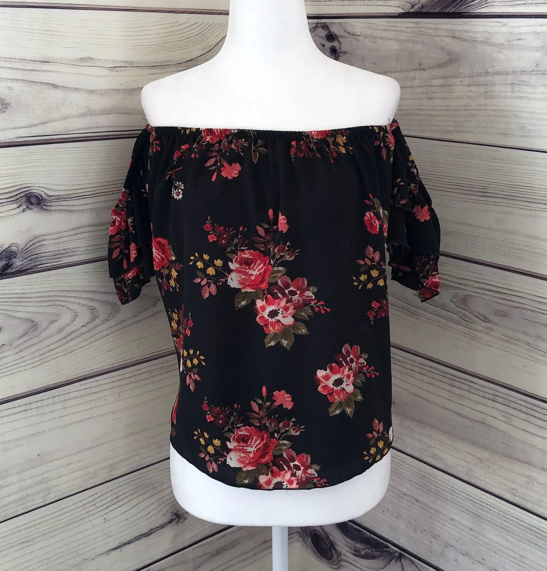 Great condition Windsor Size small Black floral off the shoulder short sleeve shirt