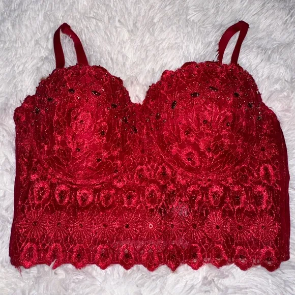 Windsor Red Bejeweled Rhinestone Lace Crop Top Bra Bralette Bodice Corset - $14 - From peachy