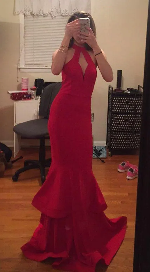 Worn once, fits snug and flares out into mermaid gown Perfect for prom or a simple cocktail/evening... Show more