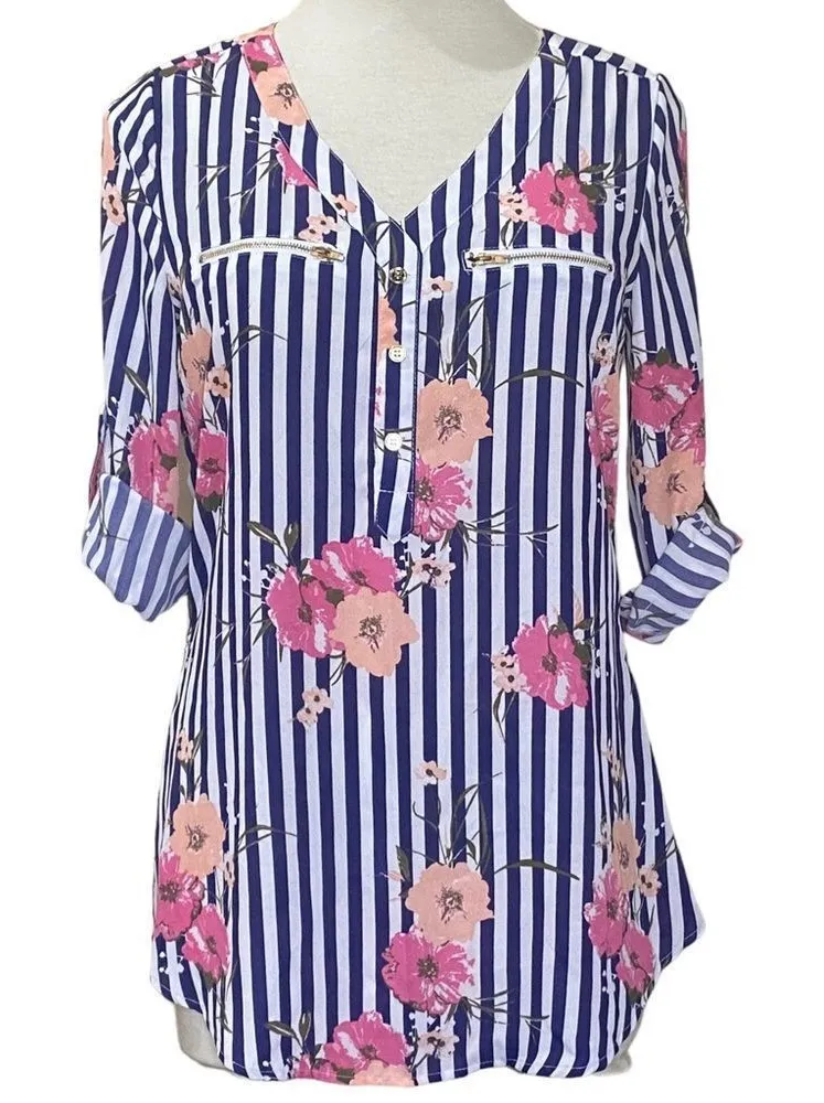 This pretty top is NEW with tags! No noted flaws! So pretty with the white and navy stripes, scattered florals Accented with gold tone buttons and gold tone zippers on faux chest pockets. Sleeves can be rolled up and secured with an inside tab. Flattering V-neck Shirt tail hem Measurements are taken laying flat and are approximate. Pit to Pit: 19" Length: 25-28" Please see pics as they are part of my description. Clean and Smoke Free Home One small dog that is NOT allowed and cannot access this area but there could be some hair transfer. FAST SHIPPING Top Rated Seller Thanks for looking!
