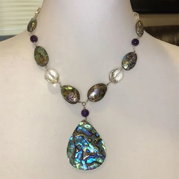 Vintage Abalone and Amethyst Cabochons Strung Interchangeably With Clear Faceted Crystal Teardrop Shape Abalone Pendant Creates Y Necklace Claps: Lobster Claw Clasp Open Link Extension Measures Approximately 1•1/2” Wearable Neck Portion of the Necklace Measures Approximately 18” Entire Necklace Including Pendant Measures Approximately 21” Long Ask Questions and/or RequestAdditional Photos, Measurements as Needed Color May Vary Based On Shadows, Lighting, Monitor, Display Settings $145