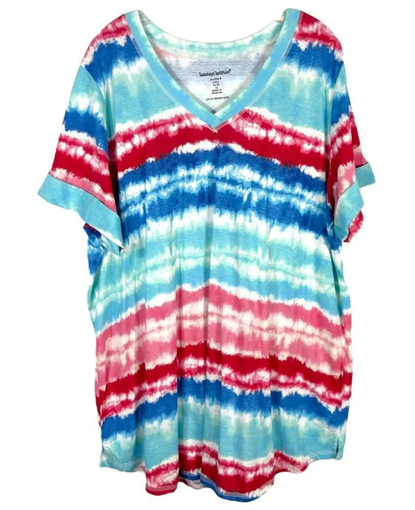 Woman Within Plus Size 1X 22W 24W Top Blue Red Tie Dye Striped V Neck 1652 Chest: 28” across Length: 34” Cotton, polyester Very good, pre-owned condition! Smoke-free, pet-free home. Ships within 1 to 2 business days. Save the planet. Shop second hand.