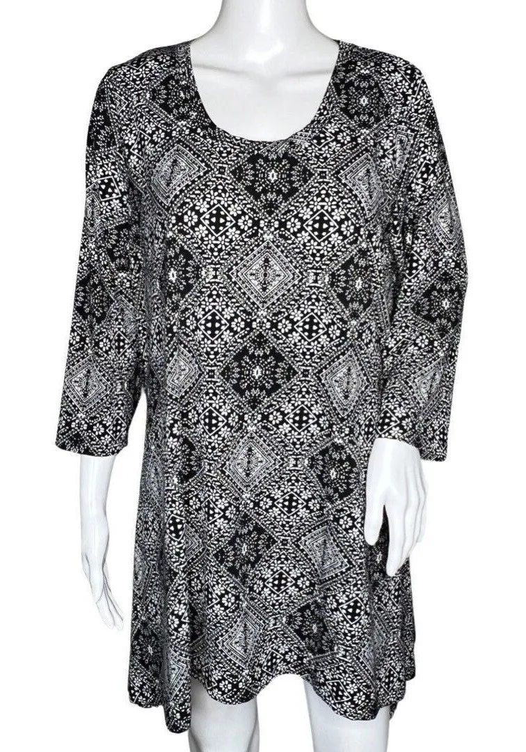 Woman Within Shirt Womens 14/16 Black White Geometric Floral Tunic Top Blouse Women's Size 14/16 Scoop Neck Top 3/4 Sleeve Sharkbite Hem Pullover Style Polyester Spandex Blend Stretch Measurements are Approximate: Length 29" to 35” Armpit to Armpit 22" Gently Used Condition. No Rips Tears or Stains (Z4)