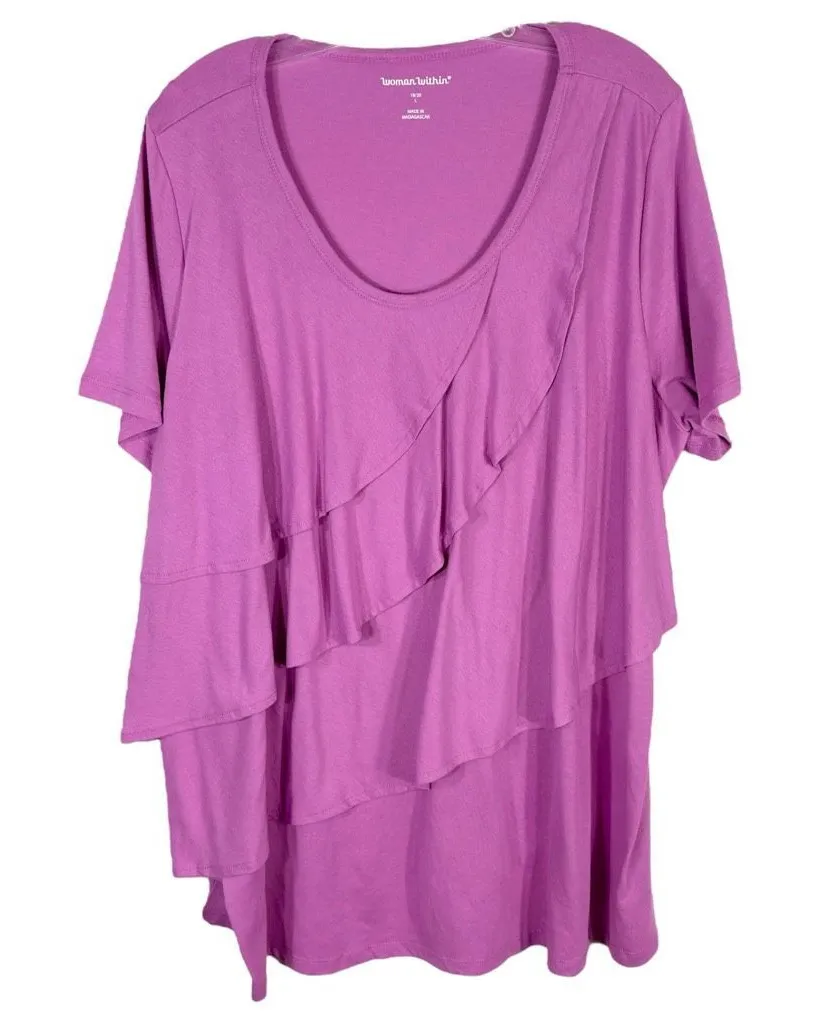 Woman Within Plus Size 18 20 Top Purple Ruffled Layered Short Sleeve Tee 782 Chest: 25” across Length: 31” Cotton, rayon Very good, pre-owned condition! Smoke-free, pet-free home. Ships within 1 to 2 business days. Save the planet. Shop second hand.
