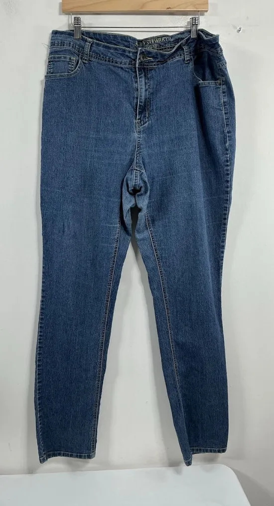 This is a pair of women's Ashley Stewart tall skinny blue jeans in size 18T. They feature a solid pattern, zip and button closure, and are made of polyester, spandex, and cotton denim fabric. The jeans have a mid-rise and a 33-inch inseam, making them suitable for all seasons. They also offer stretch for added comfort and flexibility. With a classic skinny style, these jeans are machine washable and perfect for everyday wear. Approximate measurements; Waist 19” (38”) Rise 10.5” Inseam 33” These jeans are pre owned and look to be in good condition!