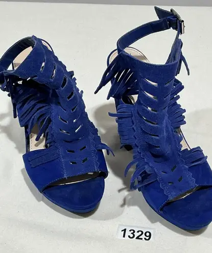 Elevate your shoe game with these stunning Bar111 sandals. Crafted from soft royal blue suede and featuring a chunky heel, these sandals are a must-have for any fashion-forward woman. The fringe accents add a touch of playfulness to the strappy design, making them perfect for any occasion. These sandals are available in size 8 and are part of the Bar111 collection. They are ideal for women looking for a stylish and comfortable shoe that can be worn for any occasion. Add these sandals to your shoe collection today and step out in style. These sandals are pre owned and in excellent condition! They look like they were never worn!