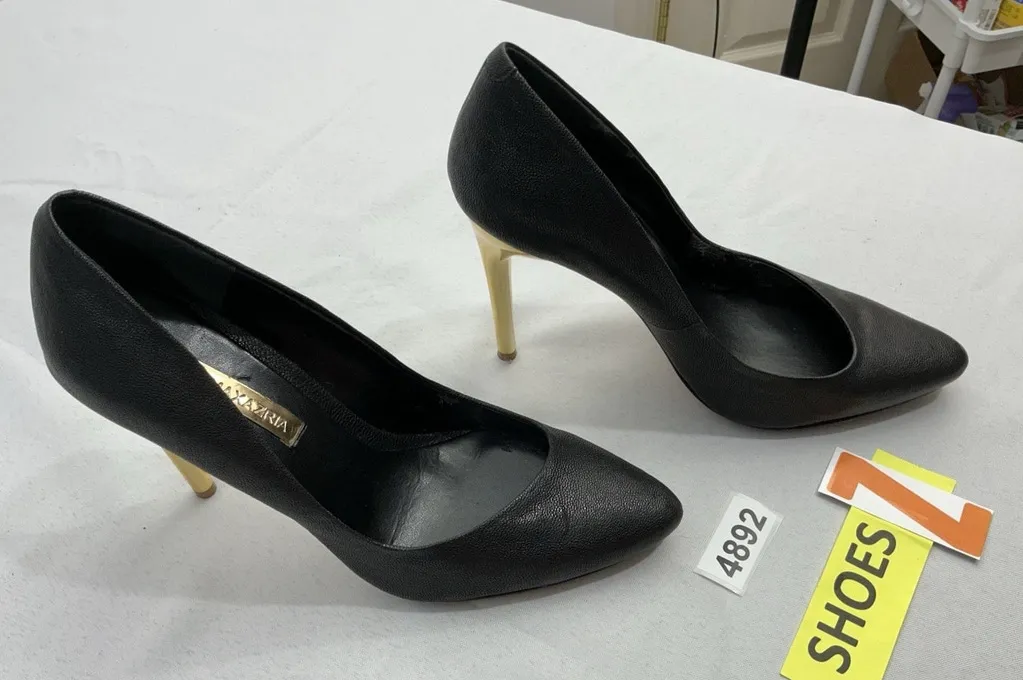 This is a pair of BCBG Maxazria Vero Cuoio Tanta pumps in black, designed specifically for women who wear a US shoe size 8M. These slip-on 5” gold colored stiletto heels are made of leather, offering a sleek and stylish look perfect for any occasion. With a stiletto heel and pump style, these shoes are sure to make a statement and elevate any outfit with their elegant design. These pumps have peeling on the inner soles ( happened when I took the sticker off) and are in good condition!