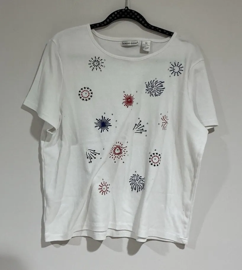 This women's Bonnie Evans T-shirt is a must-have for any fashion-savvy individual. The white fabric with red and blue embroidered design is eye-catching and unique, making it perfect for any occasion. The XL size is suitable for regular-sized women, and the T-shirt type is comfortable and versatile. The shirt is made from high-quality cotton/polyester materials, ensuring durability and longevity. The designer theme adds a touch of sophistication to the shirt, making it perfect for any stylish woman. The shirt is suitable for any casual event and can be paired with any bottom for a complete look. This is pre owned and in very good condition! Smoke free/pet free home!