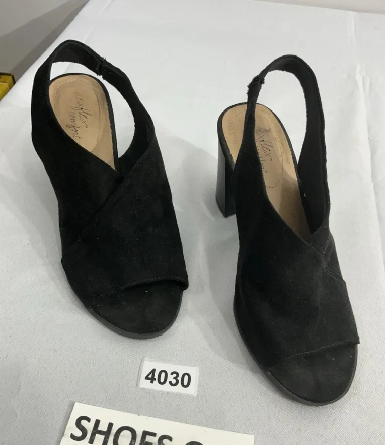 This is a pair of women's comfort shoes by Dexflex Comfort in size 10W. These black slip-on 3.5” block heels feature a peep toe design with a slingback style. Made with fabric material, they offer a comfortable fit for all-day wear. Perfect for adding a stylish and comfortable touch to any outfit, these shoes are versatile and practical for various occasions. These shoes are pre owned and look to be in good condition!