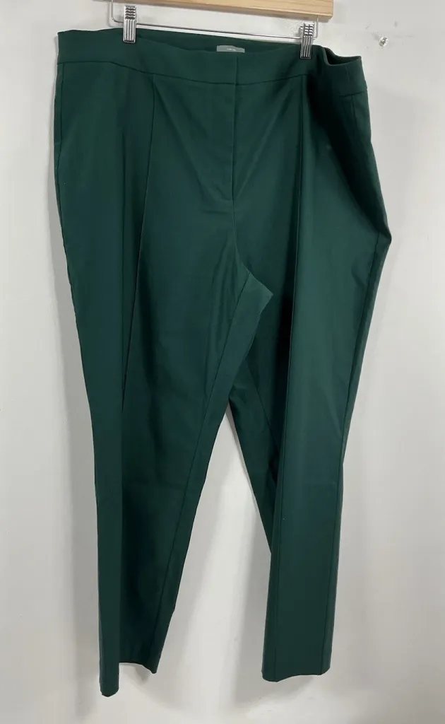 This is a pair of women's dress pants from the Worthington brand in a size 18W. The pants are in a slim fit with a high rise and a 28-inch inseam, designed for a flattering and slimming look. They feature a zipper, button, and hook & clasp closure, made from a blend of spandex, nylon, and rayon material in a stylish green color. Perfect for a professional or evening attire, these pants offer both comfort and elegance for the modern woman. Approximate measurements; Waist 20.5” (41”) Rise 12.5” Inseam 28” These pants are pre owned and look to be in excellent condition!