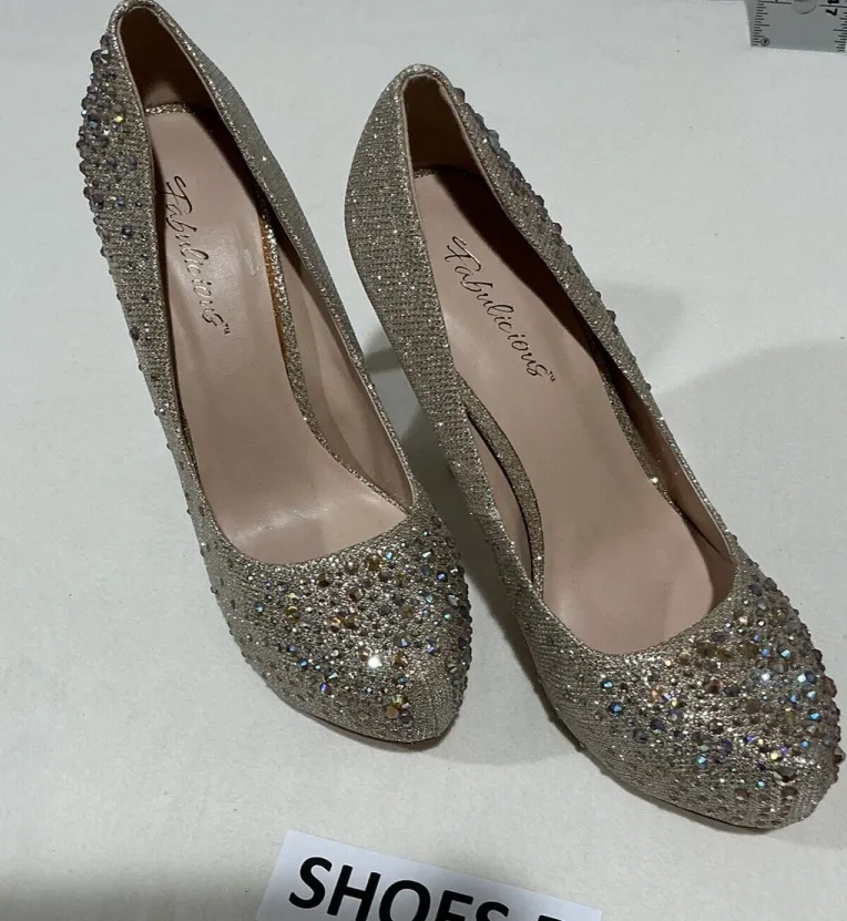 Elevate your shoe game with these stunning Fabulicious platform heels. The gold rhinestone accents add a touch of glamour to any outfit. Perfect for women who love to stand out, these pumps come in a size 11 and are ideal for any formal or semi-formal occasion. The platform style adds a touch of elegance while still providing comfort and support. Make a statement with these beautiful heels (5”) that are sure to turn heads. These are pre owned and in excellent condition!