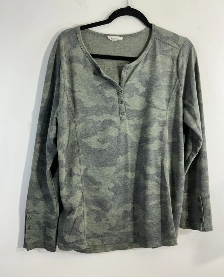 This Jane & Delancey T-Shirt is a must-have for any woman who wants to stay comfortable and stylish. The shirt is made from high-quality polyester/rayon/spandex materials and features a pullover closure that makes it easy to wear. The green camo design adds a touch of edginess to the shirt, making it perfect for any casual occasion. The shirt is available in size XL and is perfect for women who want a regular fit. The long sleeve design makes it perfect for any season and the shirt is easy to care for. This T-Shirt is perfect for any woman who wants to look good without sacrificing comfort. Measurements; Pit to Pit 22” (44”) Length 26” Arm length 17.5” This shirt is pre owned and looks to be in excellent condition!
