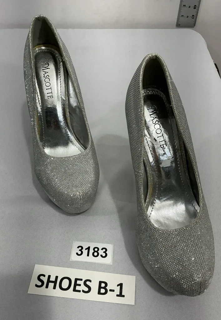 Elevate your style with these stunning Mascotte Linda 6” platform stiletto heels. The silver sparkly synthetic upper material adds a touch of glamour to any outfit, while the slip-on design makes them easy to wear. These ultra-high heels are perfect for adding a touch of sophistication to any look. The pump style and sparkly design make them perfect for any special occasion, whether it's a night out with friends or a formal event. These shoes are available in women's size 9 and are sure to become a favorite in your shoe collection. Add a touch of glamour to your wardrobe with these Mascotte Linda platform stiletto heels. These are pre owned and look to be in very good condition!