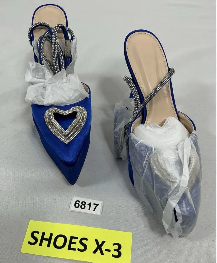 This is a pair of women's Coutco slip-on platform wedding shoes in size 8. These blue heels feature a 5.5” flared stiletto heel style with a platform design, adorned with a rhinestone heart design for added glamour. The satin upper material and buckle ankle strap closure add elegance to the overall look, making them a stylish choice for any special occasion. These shoes are NWOT!