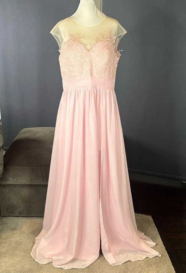 Woman’s Pink Formal Dress Gown with Sheer Lace Top a Front Leg Slit and Zip Up Back Size 14 - please see pictures for approximate lay flat measurements. There is no size tag in the dress, but it measures to a size 14. Please check your measurements to make sure this will fit Stunning pink gown featuring a sheer lace top and flowing chiffon skirt with front leg slit Beautiful Dress for all Formal Occasions - Prom, Party, Homecoming, Birthday, Celebration, Wedding Guest, Bridesmaid or Special Event! NWOT - new without tags. *Formalwear does not always fit like regular clothing, please look at the actual measurements provided to make sure this will fit you *Color is subjective and may vary based on lighting and device used to view this item 2533B137