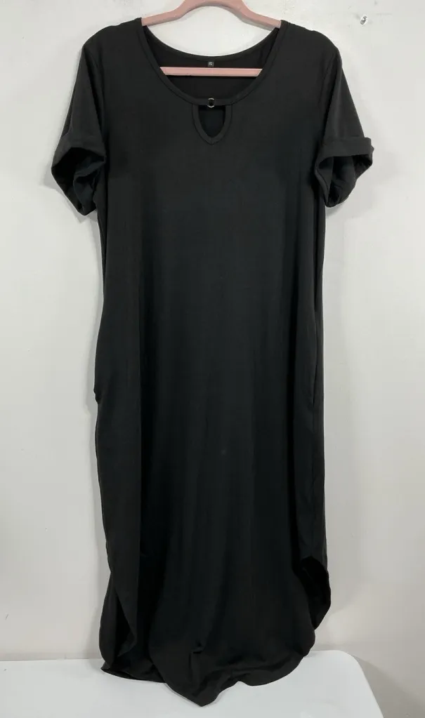 This Women's XL Black Short Sleeve Dress with Side Slits is a stylish and comfortable pullover beach coverup with pockets perfect for the beach. Made from a blend of polyester and spandex, the dress features a peekaboo chest design with side slits, adding a touch of flair to the long sundress length. Ideal for women who want a fashionable yet practical piece to wear during their beach outings or summer adventures. Approximate measurements; Pit to Pit 20.5” 41”) Length 50” Sleeve length 7” (from shoulder) This dress is pre owned and looks to be in excellent condition!