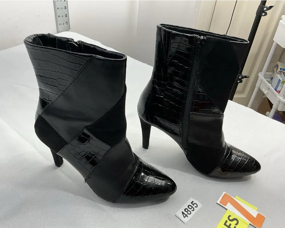 The Women's Rialto Casilda Ankle Boots in size 6M are stylish and sleek with a 3.5” high stiletto heel and crocodile detail. The black faux leather boots feature a side zip closure for easy wear. The ankle height and M width make them comfortable and fashionable for any woman looking to add a touch of sophistication to her outfit. The Rialto brand ensures quality and style, making these boots a must-have addition to any wardrobe. These boots are pre owned and look to be in very good condition!