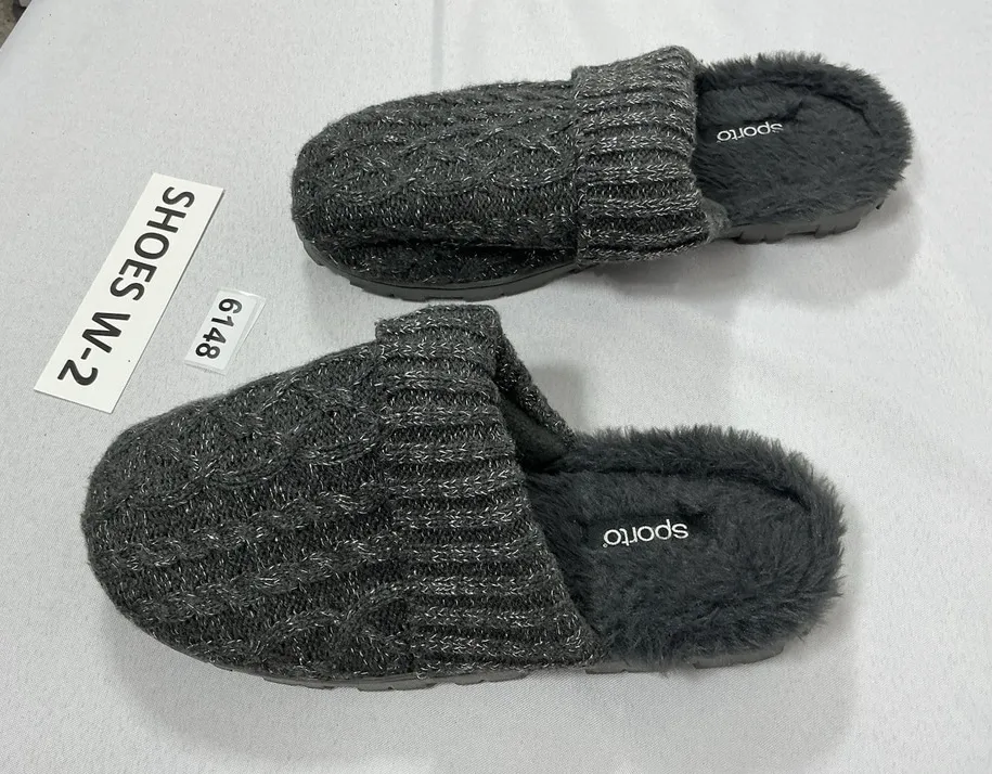 This is a pair of women's XL 11/12 gray metallic Sporto slip-on slide slippers. These slippers feature a comfortable faux fur lined interior made with sweater knit material. With a stylish slide design and easy slip-on closure, they are perfect for lounging around the house in style and comfort. The Sporto brand ensures quality and durability, making these slippers a practical and fashionable choice for women looking for cozy footwear. These slippers are pre owned and look to be in excellent condition!