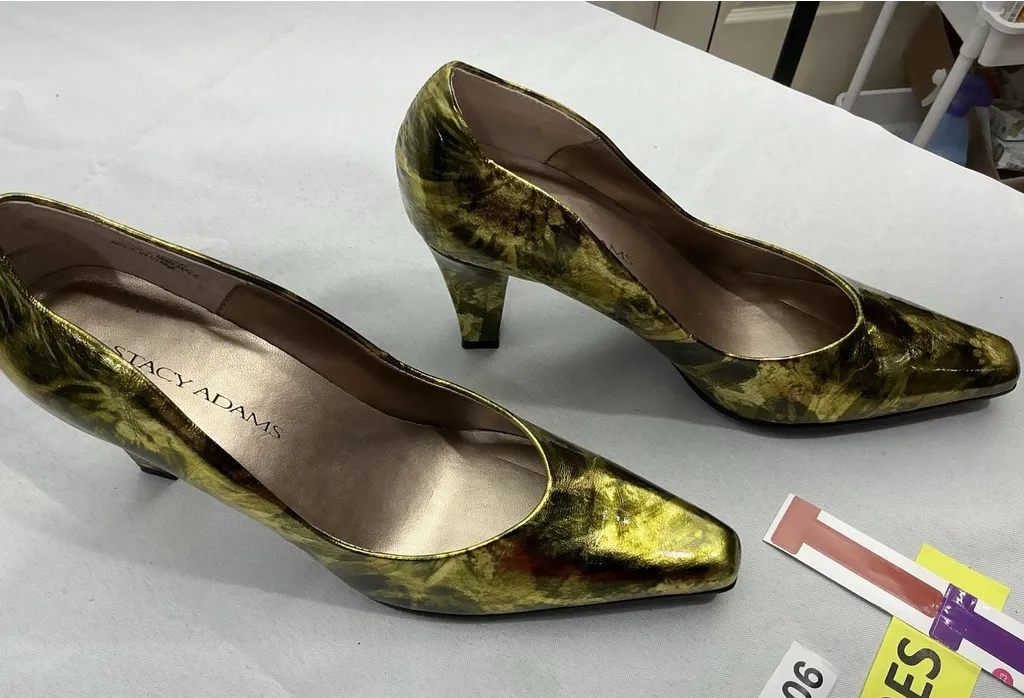 This is a pair of women's Stacy Adams Rita slip-on pumps in a gold tone color, featuring a square toe and a 3.5” high stacked heel. Made of leather with a metallic theme, these stylish pumps are designed in a pump style with a comfortable medium width. Perfect for adding a touch of elegance and sophistication to any outfit, these shoes are a must-have addition to any woman's shoe collection. These shoes are NWOT!