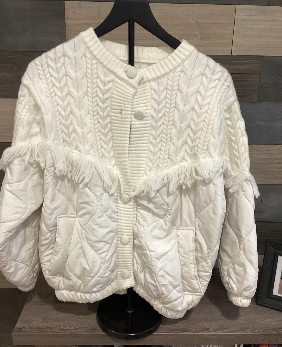 Womans Sunday Up Cream Cable Knit Fringed Quilted Puffer Jacket Cardigan Size M Size M - $23 - From Thrifted