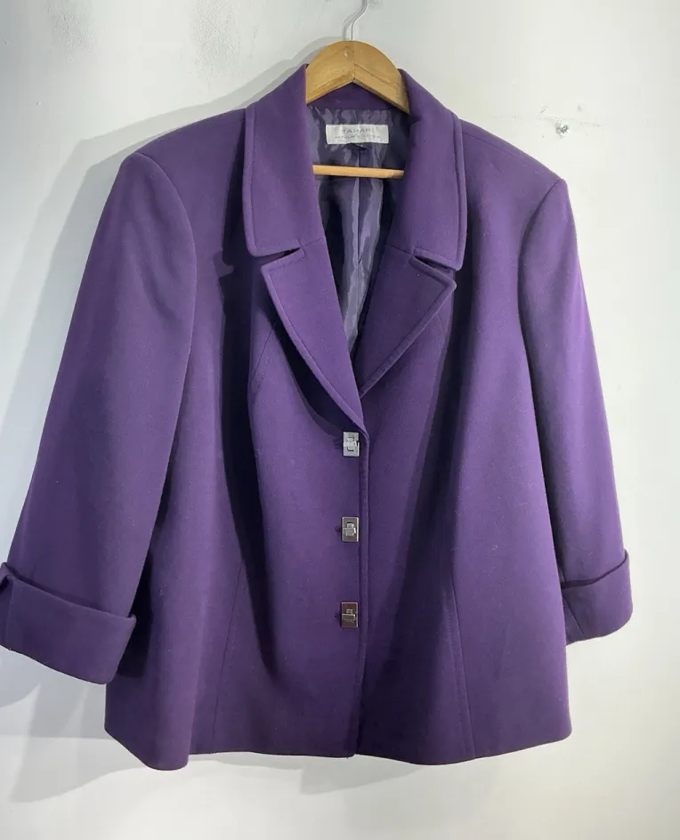 The Tahari Blazer Jacket in size 20W is a stylish and versatile addition to any woman's wardrobe. Made from a comfortable polyester rayon spandex blend, this 3/4 sleeve jacket features a metal toggle button closure and a lined interior for added warmth. The elegant purple color and basic jacket style make it easy to dress up or down for any occasion. Perfect for a plus-sized woman looking for a flattering and fashionable blazer. Approximate measurements; Pit to pit 26.5” (53”) Length 26” Sleeve length 12,5” This blazer is pre owned and has a mark (see photos …not bad) but looks to be in very good condition!