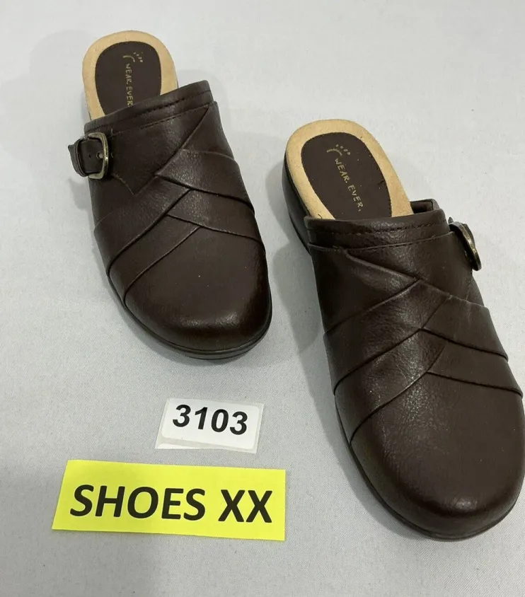Step into comfort and style with the Wear Ever Naria mules, a perfect addition to your casual footwear collection. These size 8.5 M brown wedge mules are designed with a sleek faux leather upper, offering a sophisticated look that pairs well with a variety of outfits. The convenient slip-on style ensures ease of wear, making them an ideal choice for those on-the-go days. The mules feature a comfortable medium width and a supportive wedge heel that provides a nice lift without sacrificing comfort. Suitable for women who value both fashion and function, these shoes are versatile enough to wear from a casual day out to a relaxed work environment. Embrace the blend of elegance and practicality that these Wear Ever mules offer. These are NWOT!