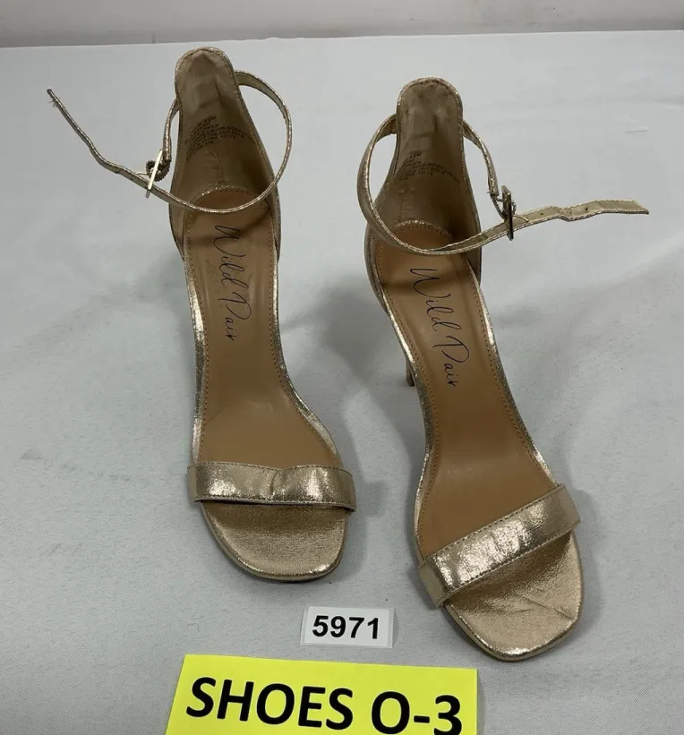 The Women's Wild Pair Blaire Slip-On Open Toe Stiletto Sandals in size 6.5M are a glamorous addition to any wardrobe. With their ankle buckle closure and 4” high stiletto heel, these gold sandals are both stylish and comfortable. The slip-on design and open toe theme make them easy to wear for any occasion, while the man-made upper material ensures durability and quality. Perfect for those who love a touch of luxury and want to make a statement with their footwear. These sandals are pre owned and look to be in excellent condition!