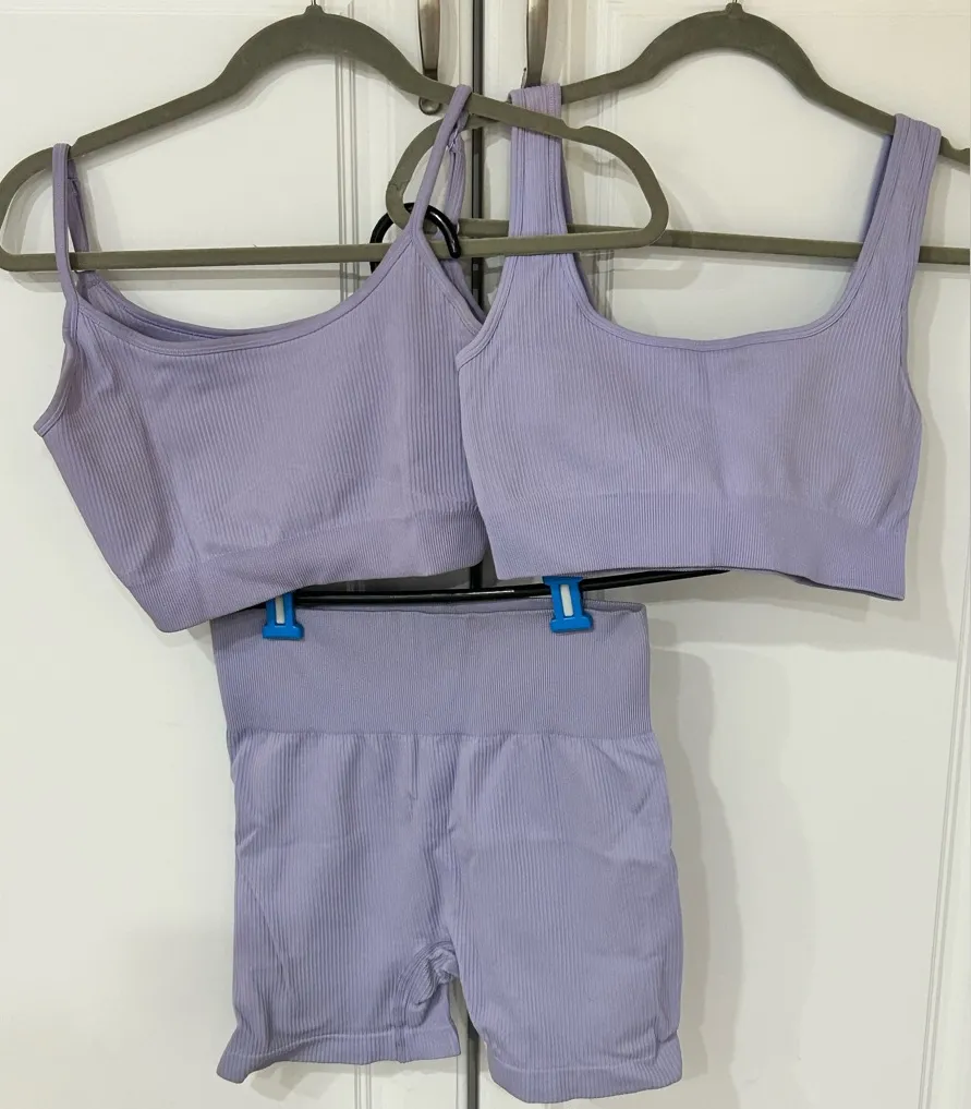 Beautiful Lilac Colored 3-Piece Women's Athletic Yoga Bundle Size Medium Quantity 2 Crop Tops and Bike Shorts Look Stylish while doing yoga, working out in the gym or a run in the park!! Thank you for checking out my listing 💕 Box 12