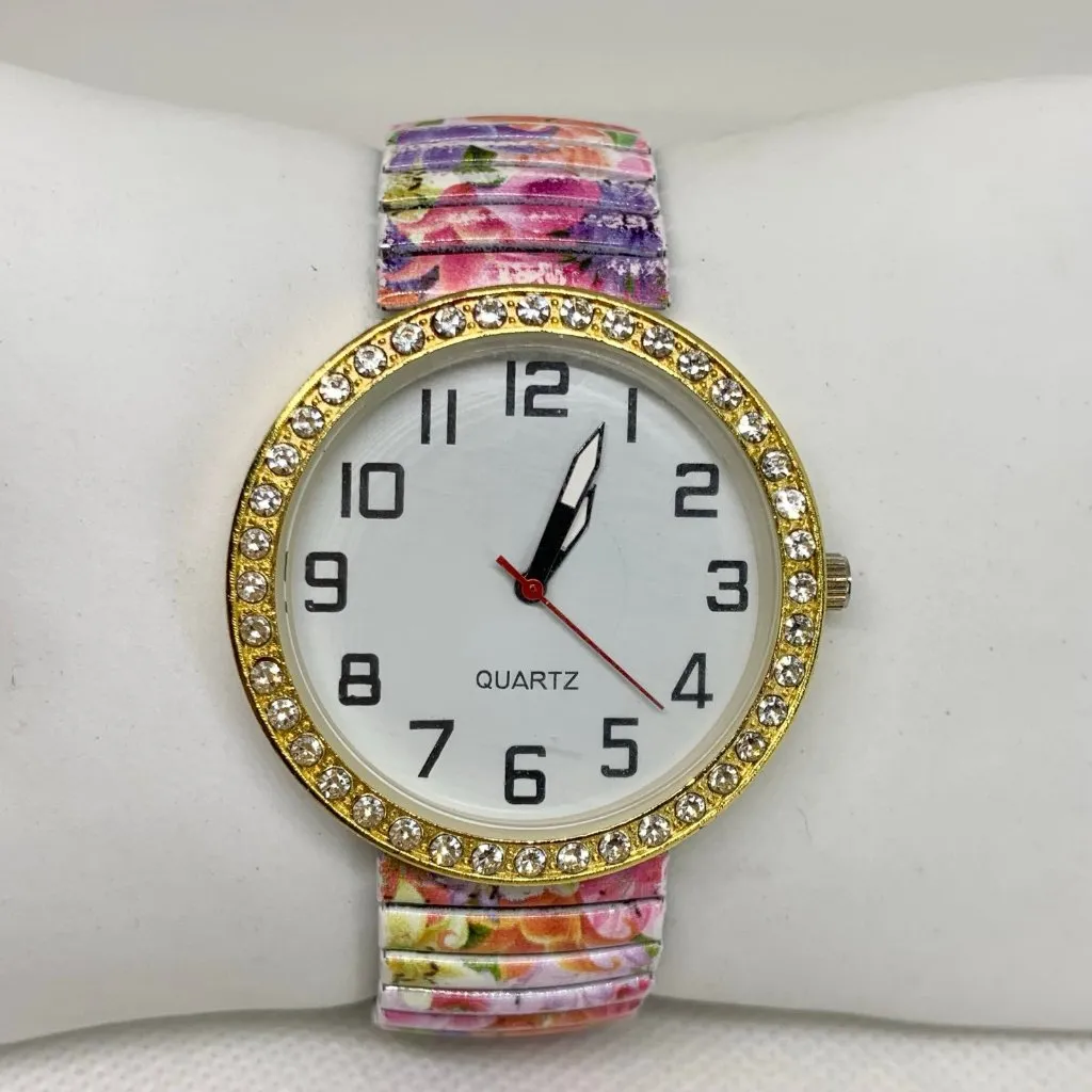 Women gold tone watch 39mm round rhinestones quart floral band 6.5” running - $15 - From Watch