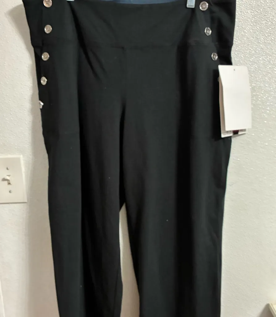 Elevate your style with these chic black high-waisted pants. Perfect for any occasion, these pants offer both comfort and elegance. Nice wide leg figure flattering tummy control slimming black slacks. Has slimming side faux buttons. Waist 19” not stretched Length 38” Inseam 28”